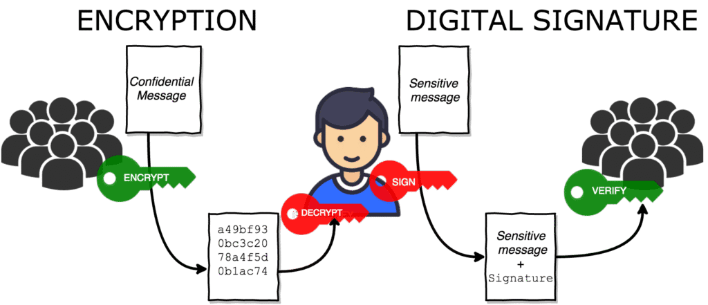 - امضای دیجیتال Digital Signature: برای تضمین اصالت و یکپارچگی یک فایل، فرستنده آن را با استفاده از کلید خصوصی خود امضا میکند. هر کسی که کلید عمومی فرستنده را در اختیار داشته باشد، میتواند از طریق آن، صحت امضا را تأیید کرده و اطمینان حاصل کند که پیام یا فایل مورد نظر توسط فرستنده اصلی ارسال شده و در مسیر انتقال دستکاری نشده است.