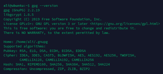 پس از اتمام نصب، میتوان با دستور gpg --version از صحت نصب و شماره نسخه GnuPG اطمینان حاصل کرد.